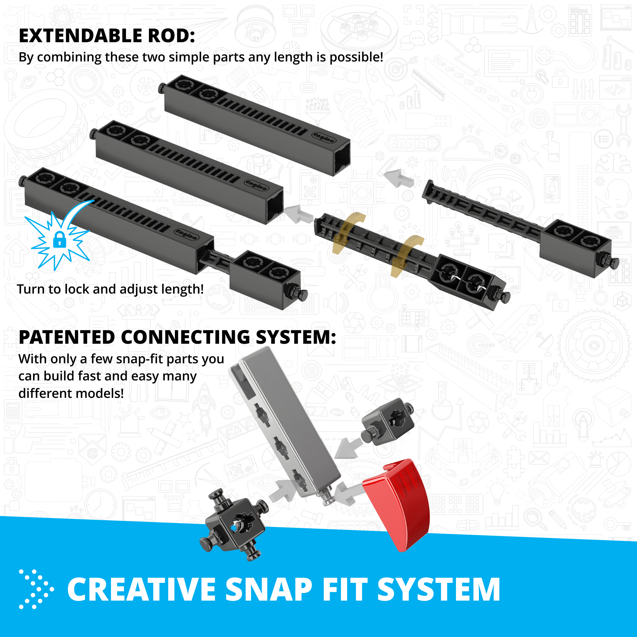 The new INVENTOR MECHANICS series has a thematic approach with multi model capabilities, featuring an impressive main model. A new library of patent-pending components has been added to the ENGINO® system which enhances both aesthetics and technical features. These parts include high-precession wheels, mechanisms and snap-fit curved surfaces. The smaller sets in the series are suitable for 7 year olds, while older children are challenged with the bigger sets which also include a geared motor. The top of range steps-up the complexity with Robotics technology, Bluetooth connectivity and software control.